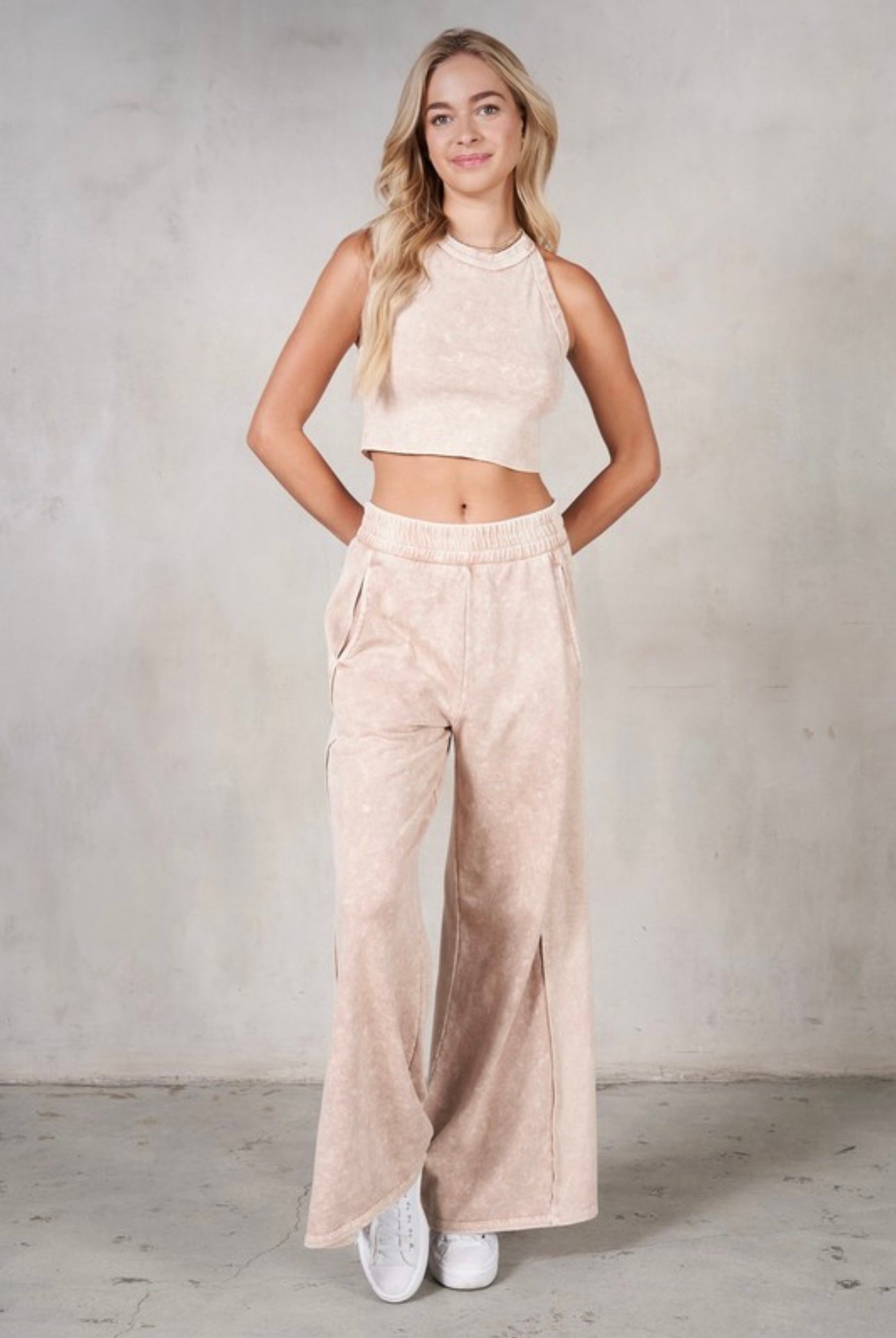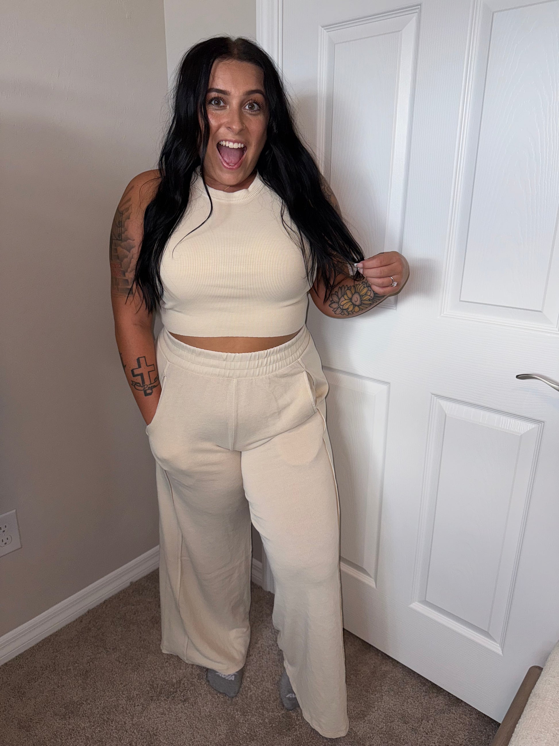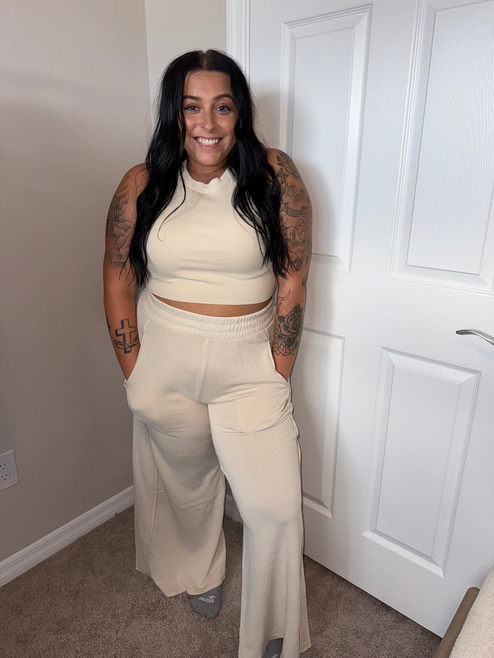 Get ready for every day with our Everyday Set in Butter! This stylish set includes a halter neck tank top and wide leg bottoms, both in a beautiful butter color. Stay comfortable and chic all day long.
